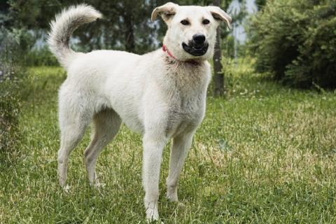 Маша весит 25 кг, рост в холке по колено.
